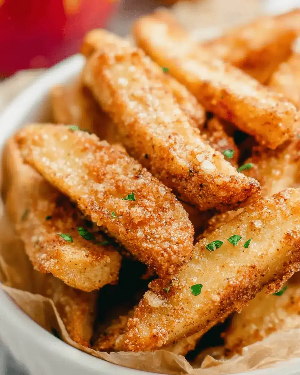 In a separate mixing bowl, whisk together eggs and vanilla extract. Dredge the apple wedges in this egg mixture, then return them to the flour container for a second coating. This dual-layer will give your fries an extra crunch—because who doesn’t love that satisfying bite?