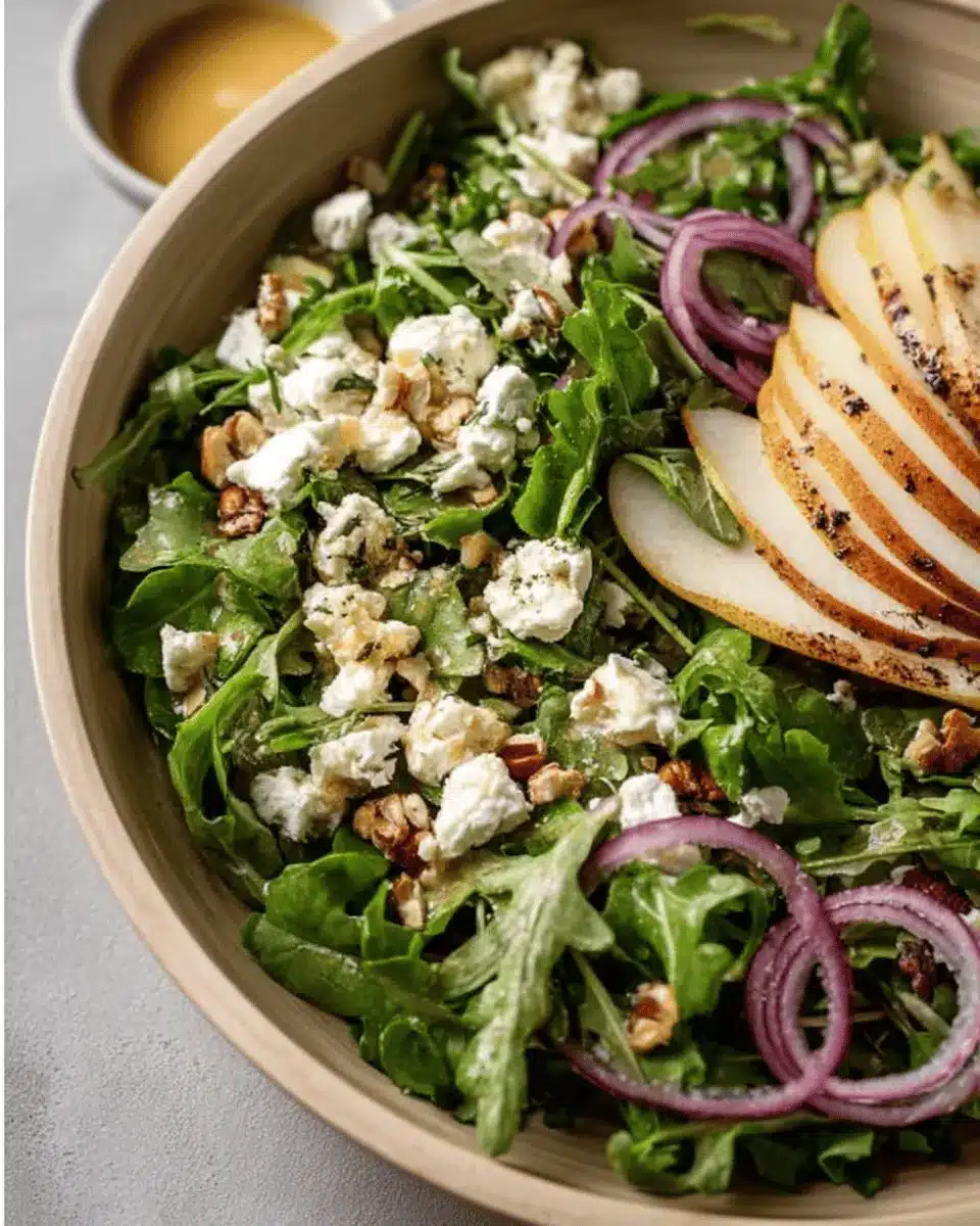Once your dressing is ready and your walnuts are toasted, it’s time to bring everything together. In a large bowl or on a decorative platter, layer the arugula, red onion, pear slices, toasted walnuts, goat cheese, and blue cheese. Tossing it gently ensures that each bite will be flavorful without causing the greens to wilt.