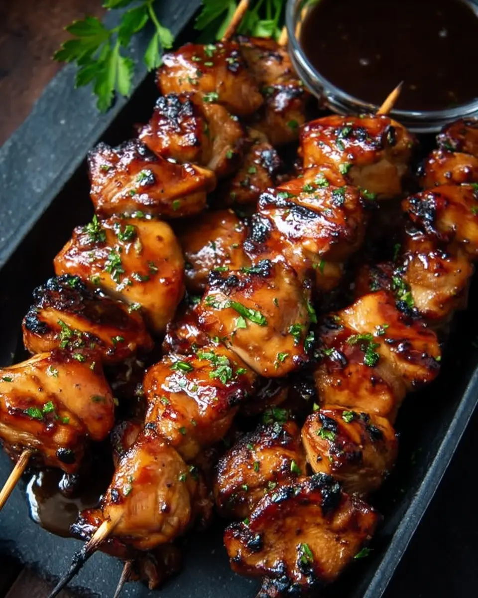 - Brush the glaze over the cooked chicken skewers and garnish with fresh parsley.