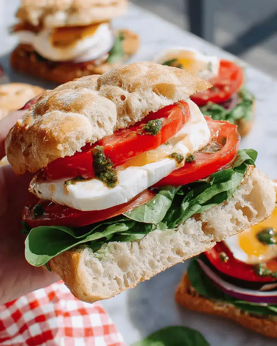 If you’re looking for a delicious plant-based twist, a Vegan Caprese Sandwich is a fantastic choice! Substitute fresh mozzarella with sliced avocado for a creamy texture. Amplify the flavors by adding a slather of vegan pesto. This not only keeps the essence of the classic Caprese but also introduces a rich herbaceous note that’s simply divine.