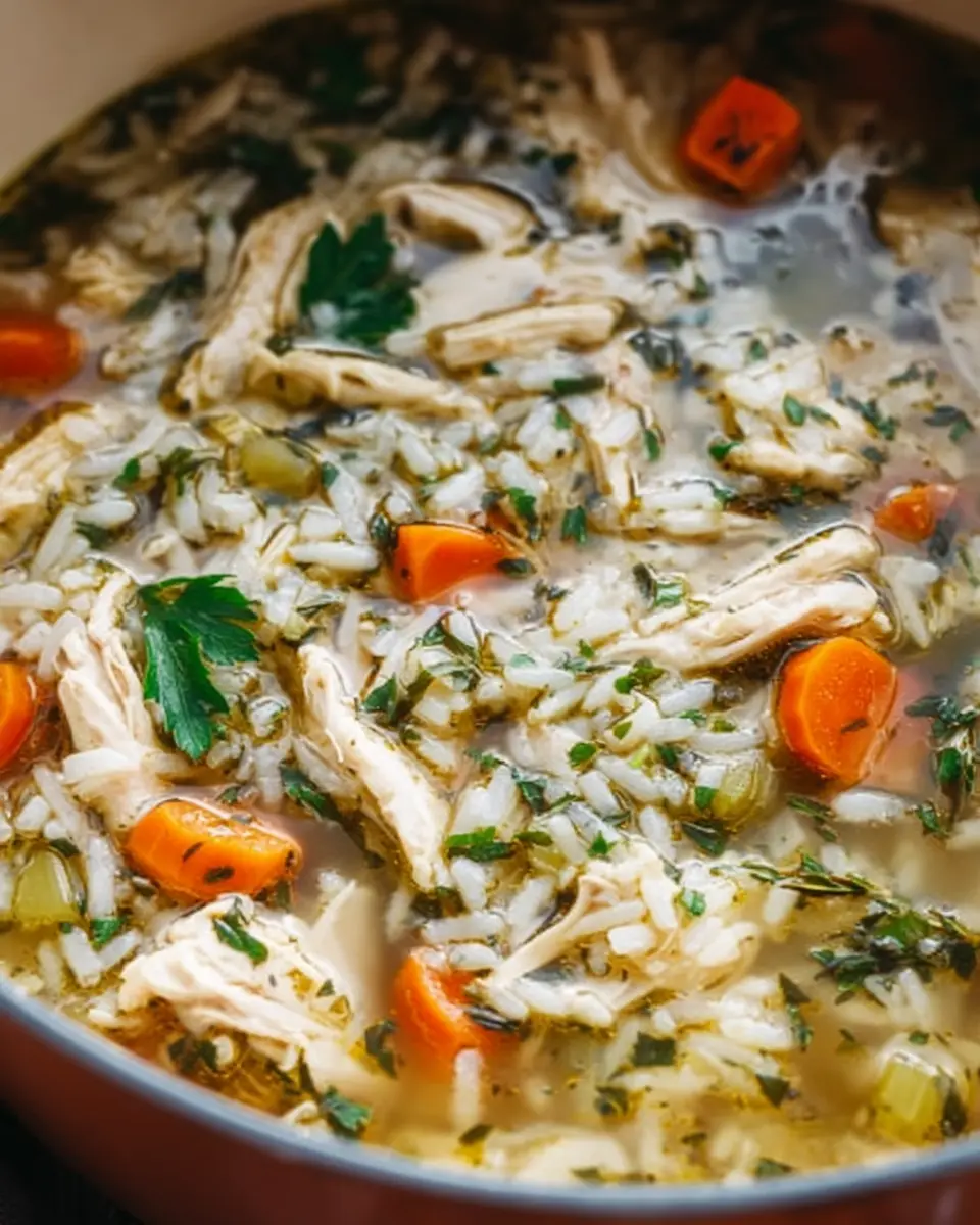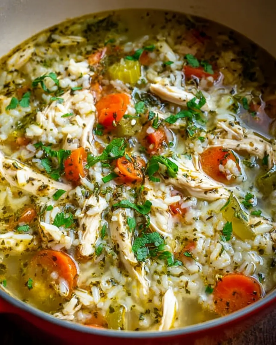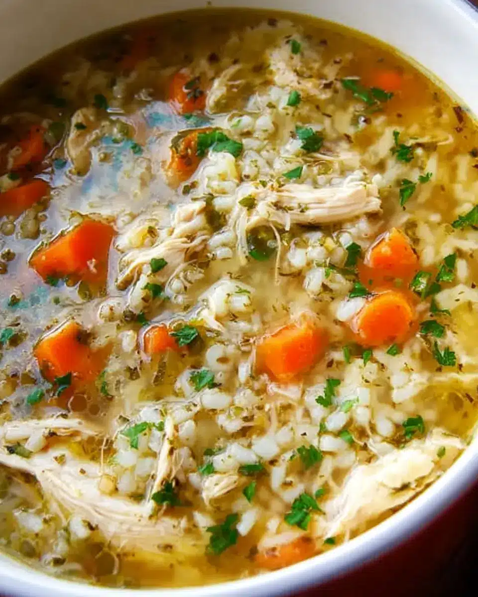 Make your Chicken and Rice Soup visually appealing by ladling it into deep, rustic bowls. Garnish with a sprinkle of fresh parsley or a drizzle of olive oil for a touch of elegance. For a fun twist, serve it in hollowed-out bread bowls — not only a dish, but a delightful edible vessel!