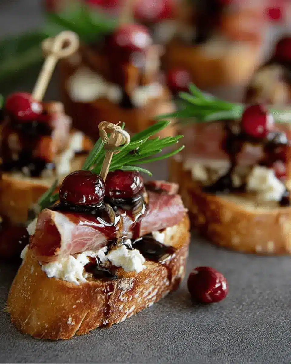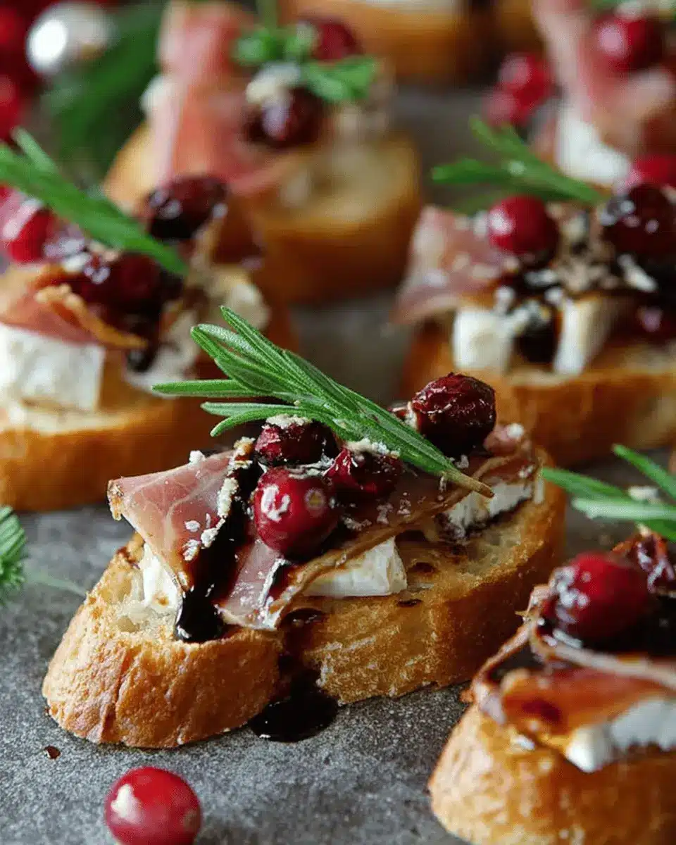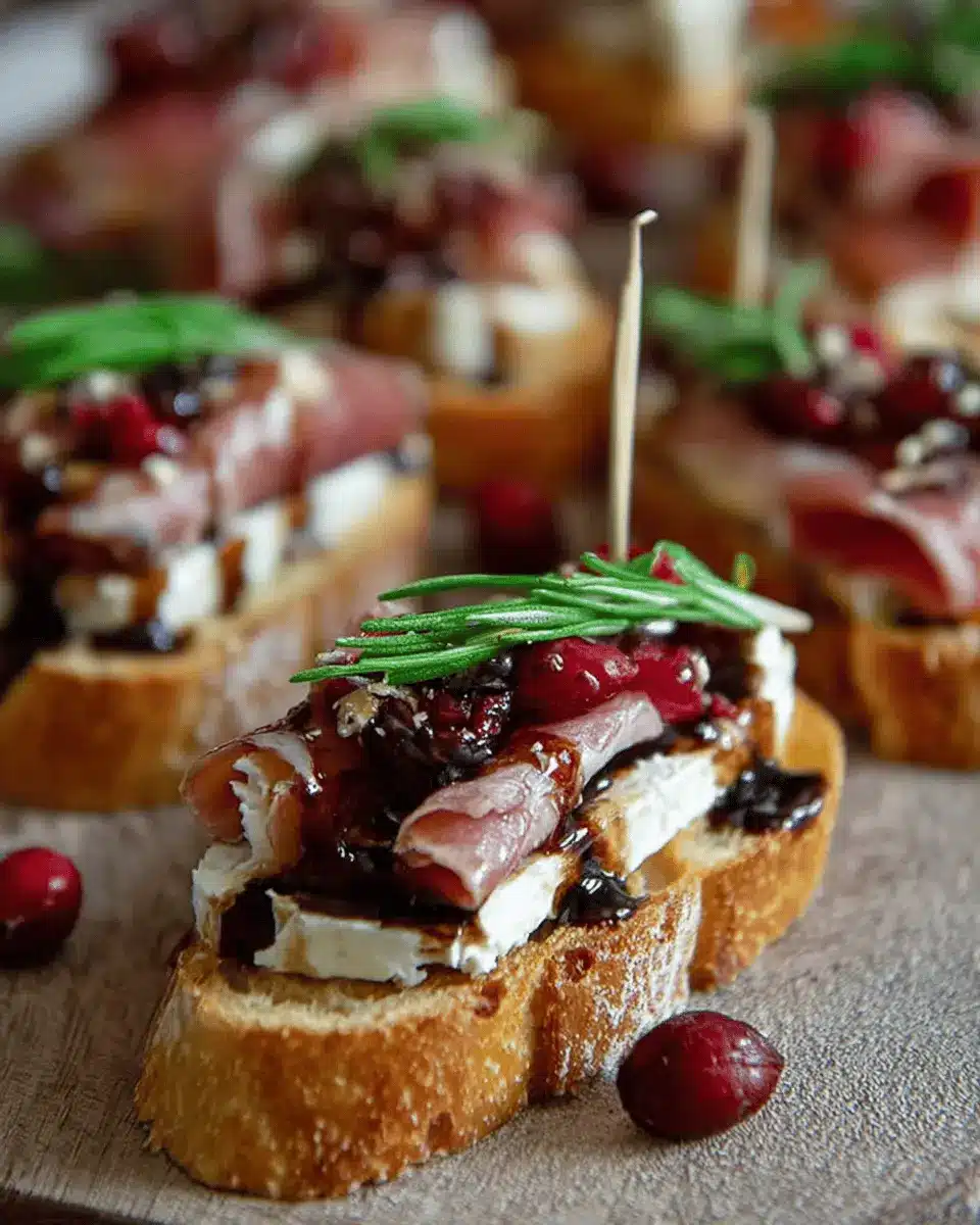 Cranberry, Brie and Prosciutto Crostini with Balsamic Glaze