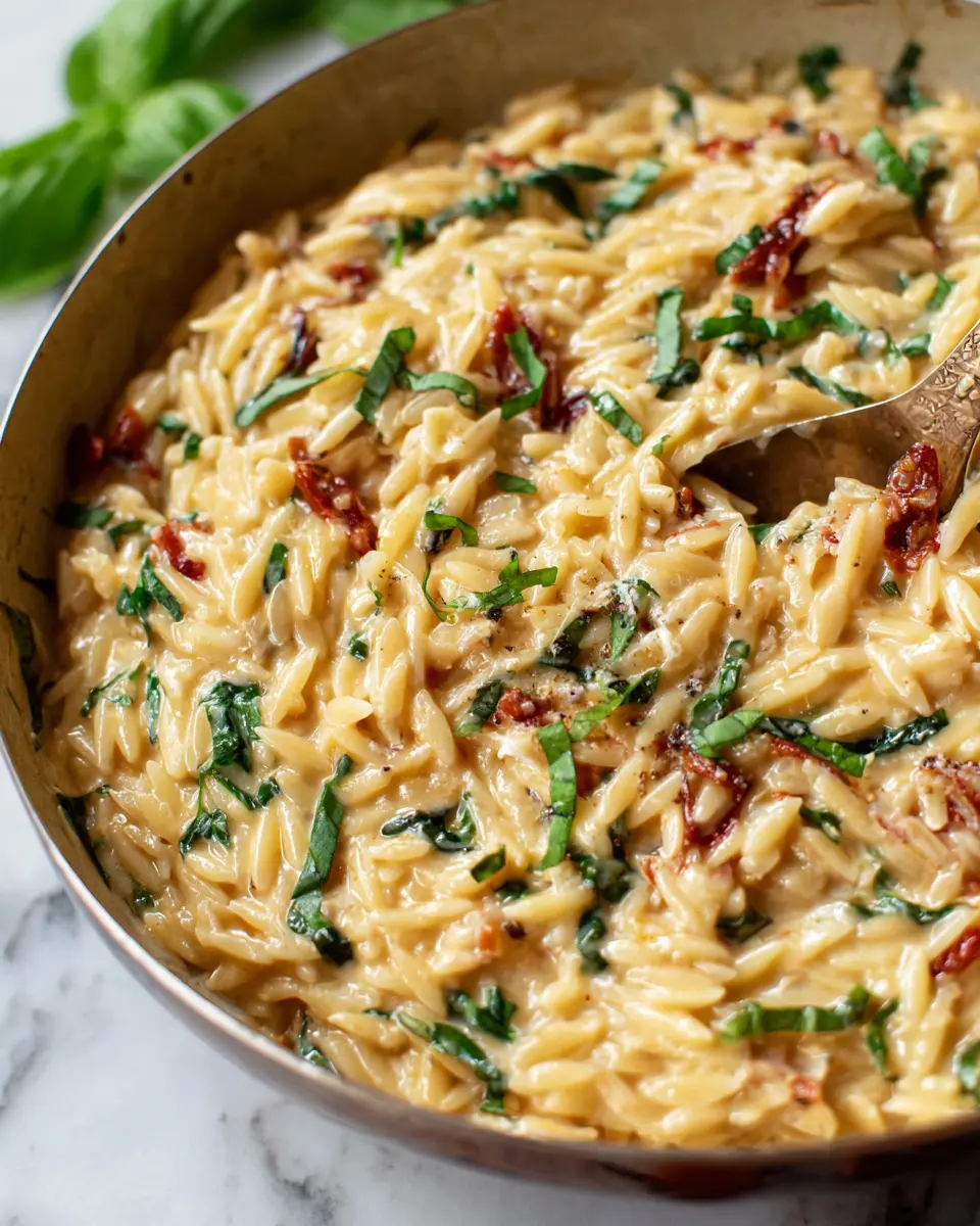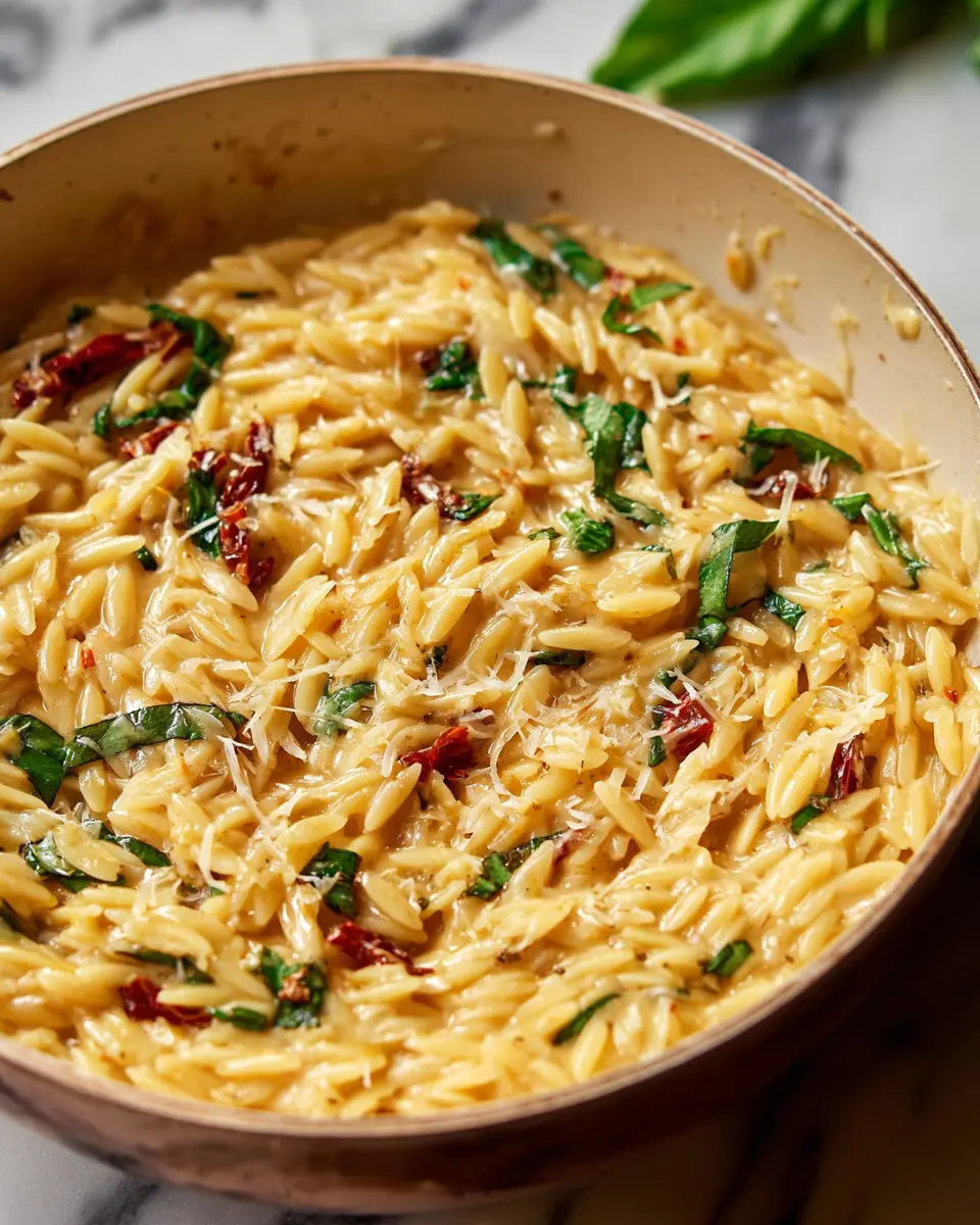 When serving your Creamy Tuscan Orzo, elevate the presentation by plating it in shallow bowls. Top each serving with a sprinkle of freshly grated parmesan and a few basil leaves for a pop of color. A drizzle of olive oil or a squeeze of lemon adds a nice finishing touch. Don't forget to serve it with warm garlic bread for a delightful touch! For a touch of elegance, consider using vibrant dishware or garnishing with edible flowers.