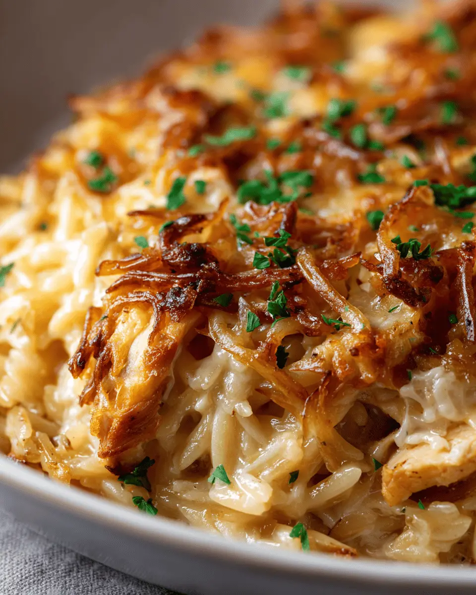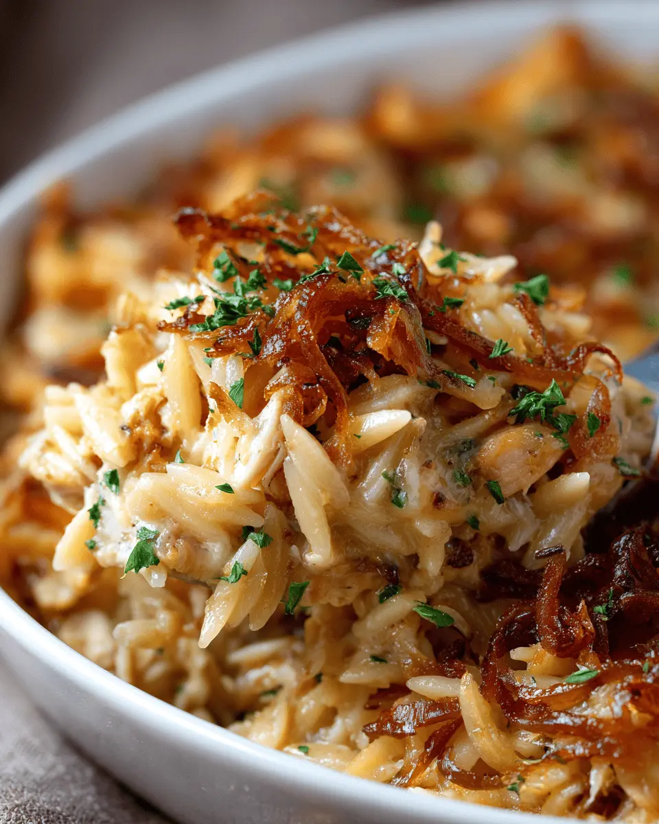 In summary, this French Onion Chicken Orzo Casserole is the epitome of comfort food. Not only is it an easy one-dish meal, but it also packs incredible flavor with caramelized onions and cheesy goodness. Perfect for weeknight dinners, your friends and family will surely love it!