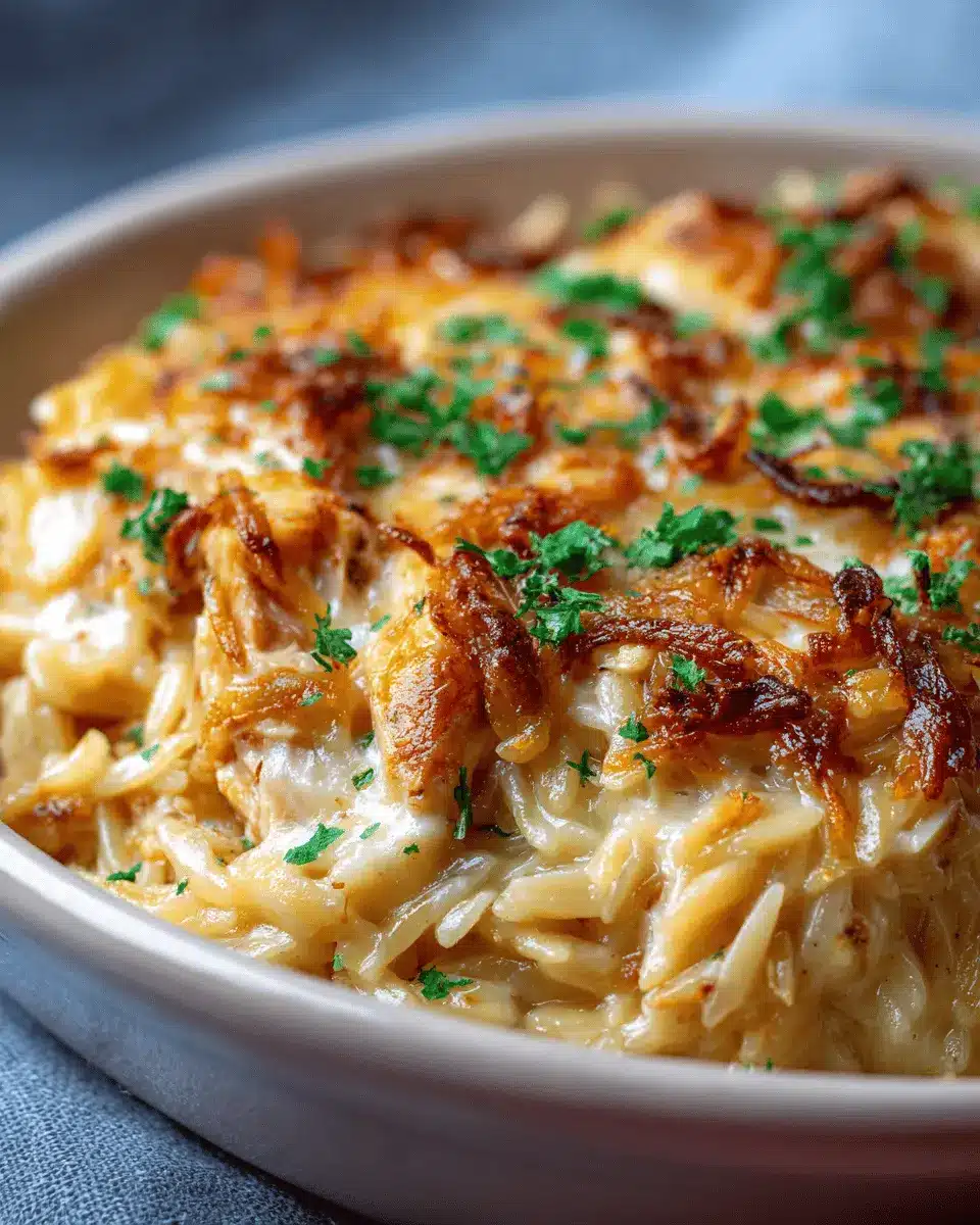 If you're looking for a cozy, comforting meal that’s as easy to prepare as it is delicious, the French Onion Chicken Orzo Casserole is your answer. This dish combines the rich flavors of caramelized onions and tender chicken with al dente orzo pasta, all enveloped in a creamy, cheesy sauce that is simply irresistible.