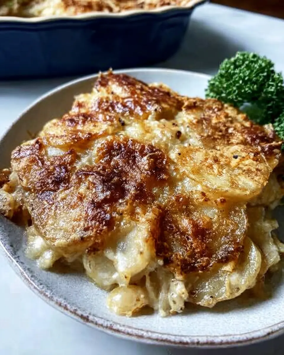 Elevate your dining experience by topping your French onion potato bake with crispy turkey bacon or strands of savory chicken ham before serving. This not only adds texture but packs in flavor. Consider serving it in individual ramekins for a more elegant presentation—perfect for dinner parties. Lastly, don’t forget to sprinkle some fresh herbs like chives or parsley right before serving; they add a pop of color and freshness that enhances both taste and visual appeal. For more serving tips, check out these side dish ideas.