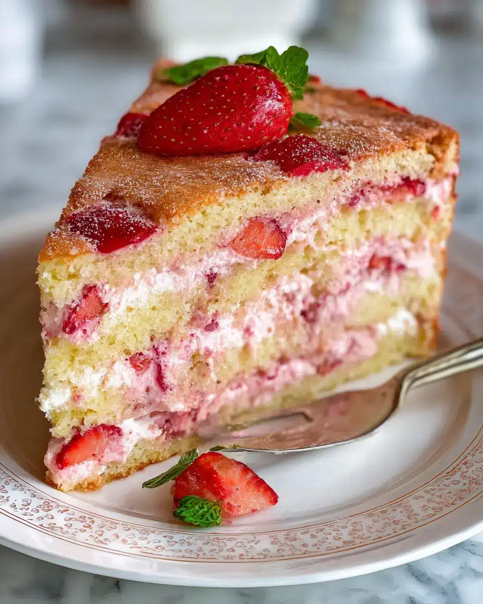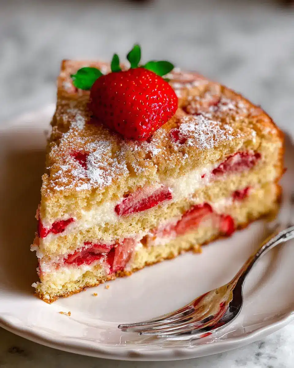 Make your French Strawberry Cake the star of your dessert table by presenting it on a decorative cake stand. Garnish the edges with whole strawberries and a light dusting of powdered sugar for an elegant finish. If hosting a brunch or picnic, consider individual servings in mason jars, layered with whipped cream and strawberries for a charming, portable option. This not only enhances the visual appeal but also allows for easy serving—perfect for sharing with friends!