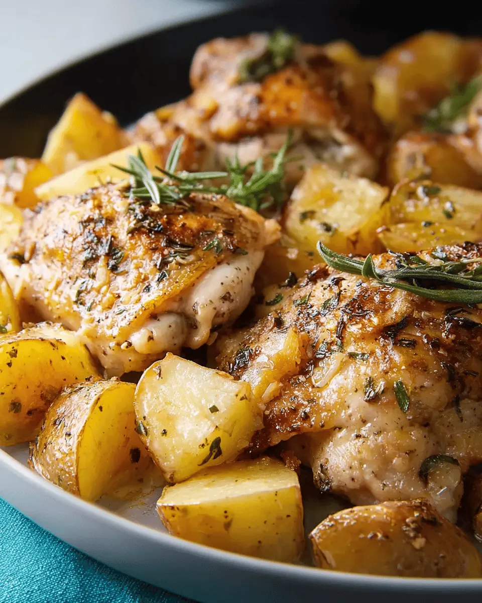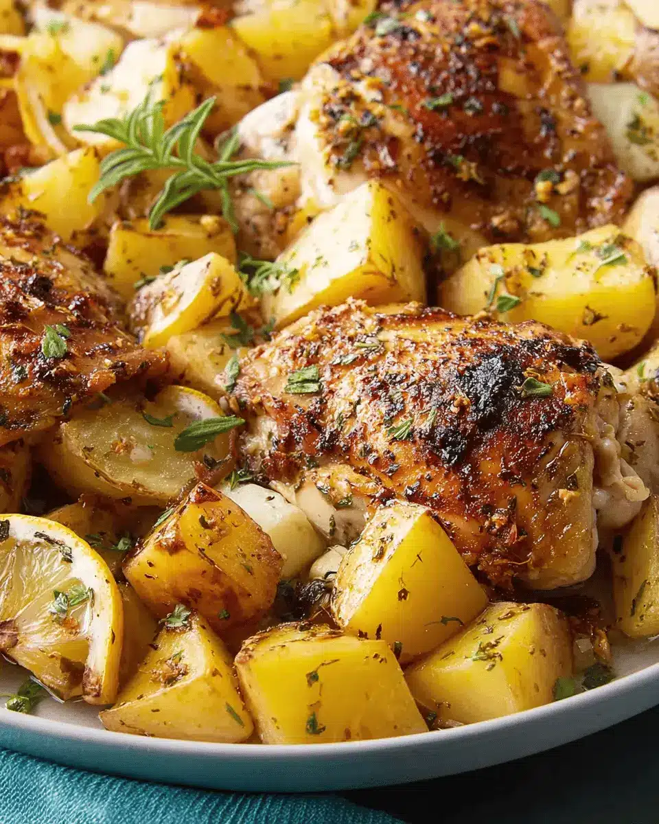 Imagine crispy, golden-brown chicken thighs infused with the distinct flavor of fresh lemons and aromatic garlic, paired with perfectly roasted potatoes that soak up all the delicious juices. It’s an easy one-pan dish that means less cleanup and more time to enjoy your meal. Plus, you can customize it—add your favorite vegetables, or tweak the seasoning to match your preference.