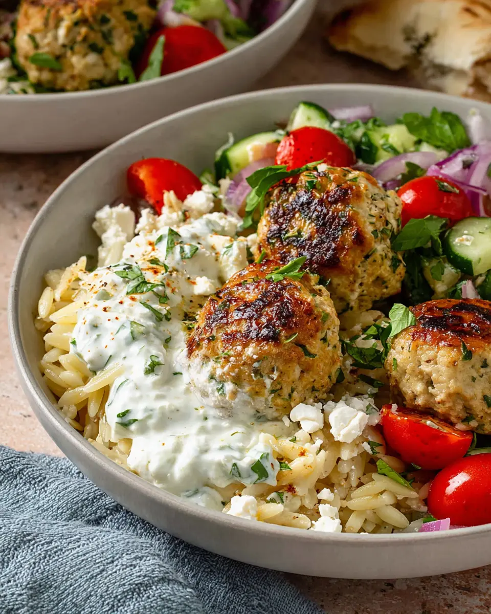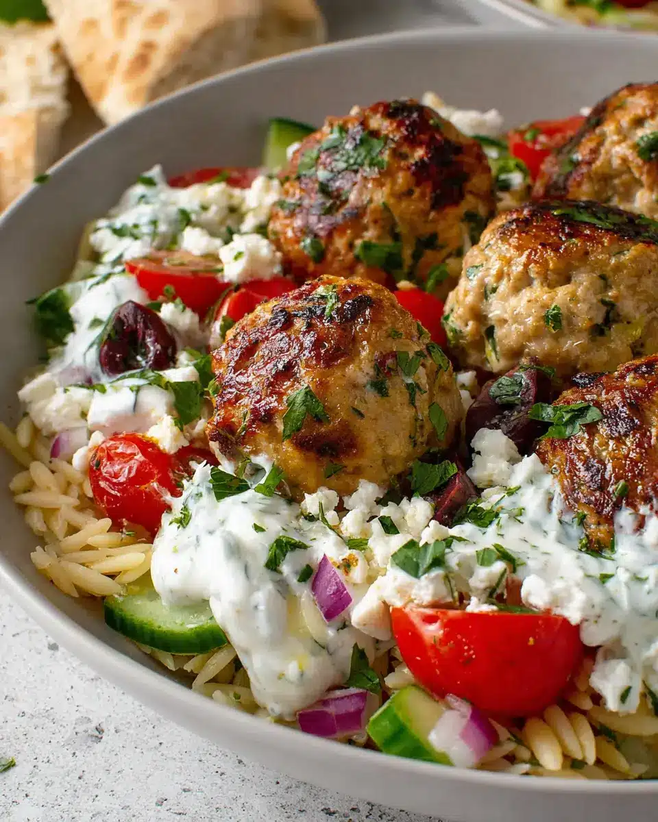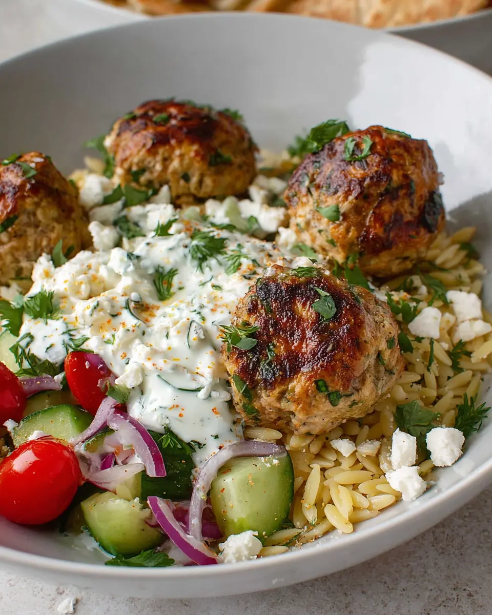 Greek Turkey Meatballs with Orzo and Tzatziki Sauce