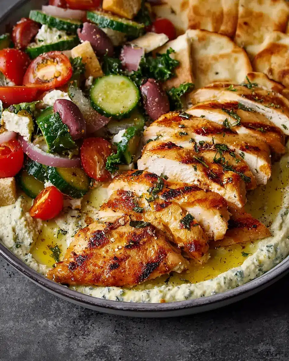While your chicken is resting, it’s the perfect time to prepare your fattoush salad. In a medium bowl, toss together halved grape tomatoes, sliced Persian cucumber, rinsed and chopped red onion, halved Kalamata olives, torn fresh mint or parsley, the remaining banana pepper slices, and the crispy pita pieces. Drizzle in 1 tablespoon of olive oil and the remaining teaspoon of lemon juice, then season to taste with salt and black pepper. This salad brings a refreshing crunch that balances beautifully with the creamy dip and grilled chicken.