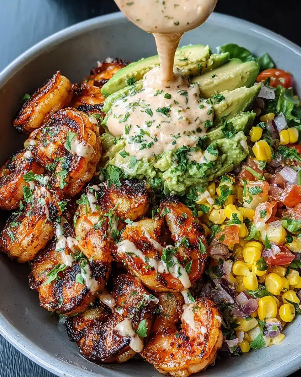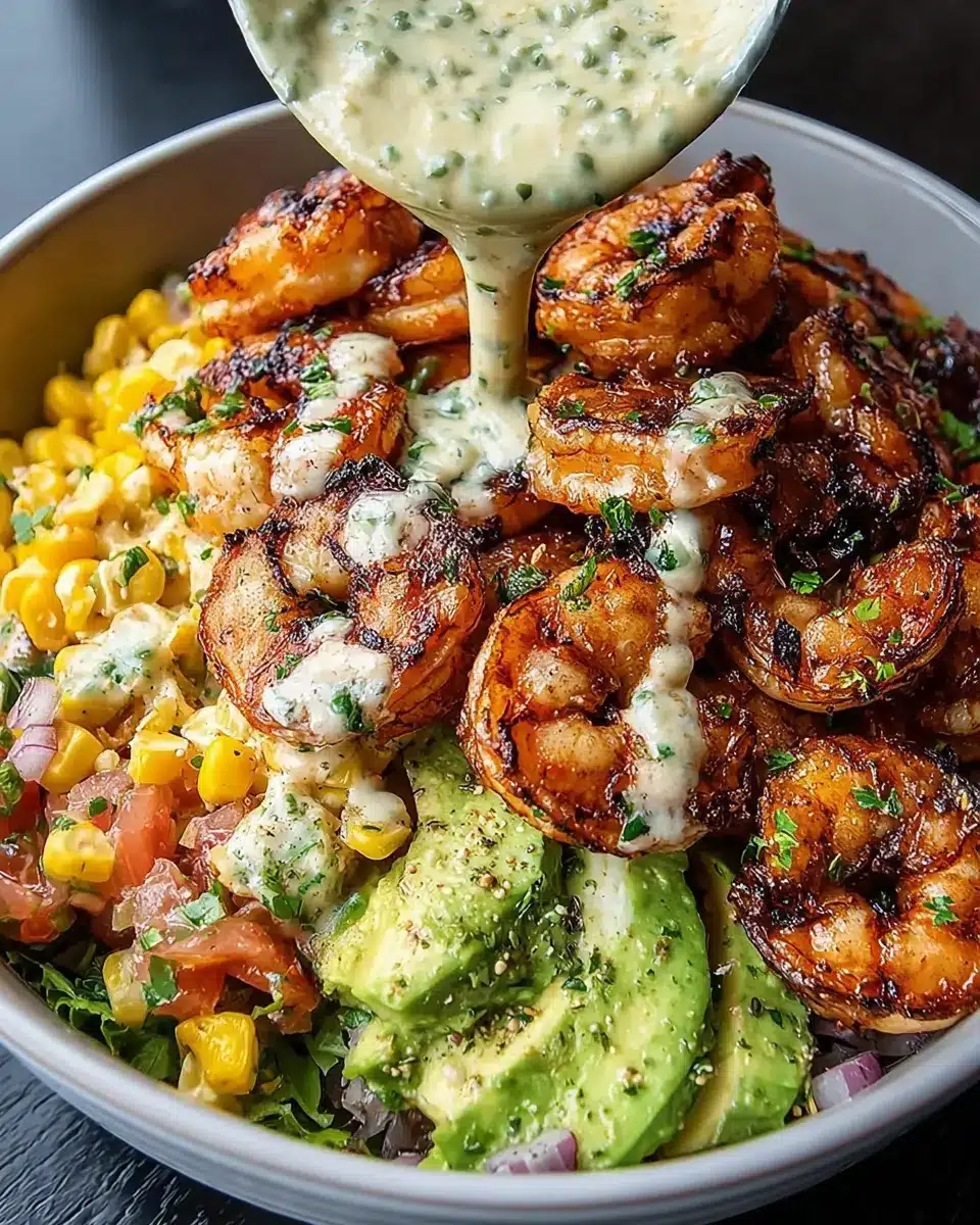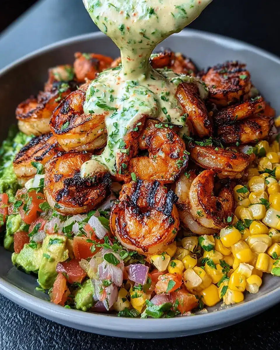 Grilled Shrimp Bowl with Avocado, Corn Salsa & Creamy Sauce