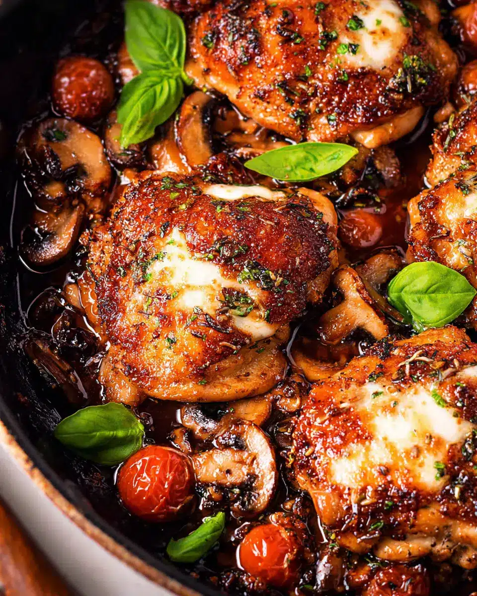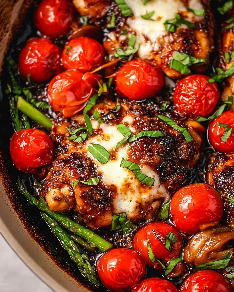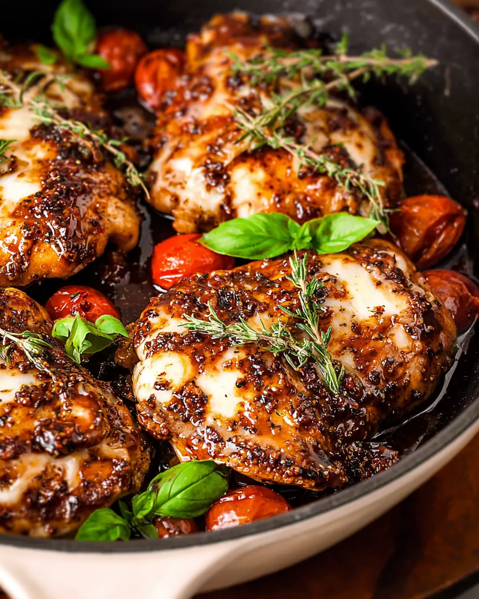 Now, pour the balsamic mixture over the chicken, letting it come to a gentle simmer. Carefully remove the skillet from the heat, cover the chicken with the mozzarella-tomato mixture, and transfer it to a preheated oven at 400°F. Bake for 18-23 minutes until the chicken is fully cooked (165°F internal temperature). Let it rest for about 5 minutes before serving, allowing flavors to meld beautifully.