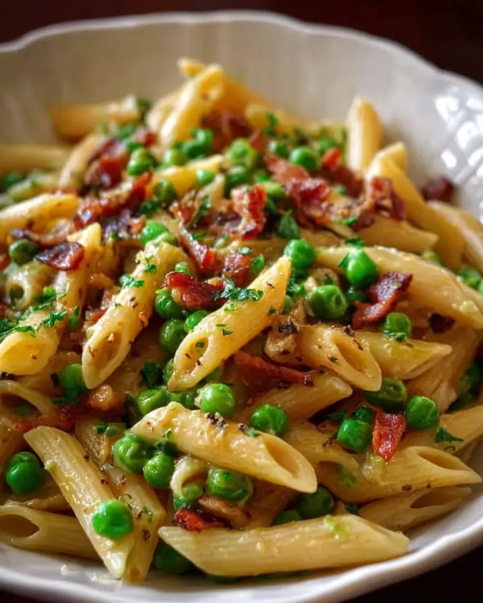 To round out your meal, pair the pasta with a simple side salad of mixed greens, tossed with a light vinaigrette. Garlic bread is another fantastic option, allowing the creamy sauce to be savored even more. For a healthy twist, consider steamed asparagus or roasted vegetables. These sides not only enhance the flavors of your Penne Pasta, Peas and Bacon but also add some vibrant colors to your dining experience!