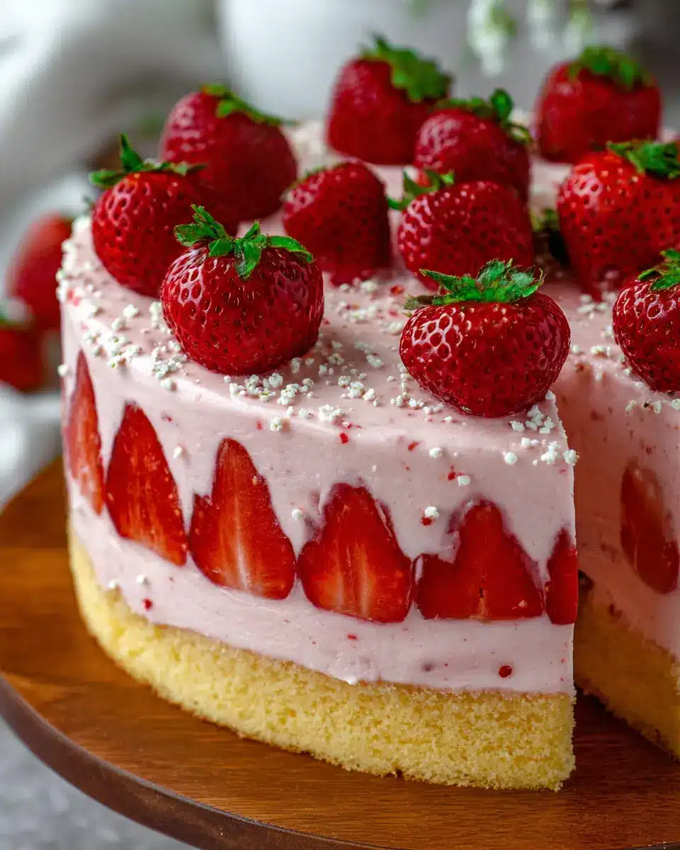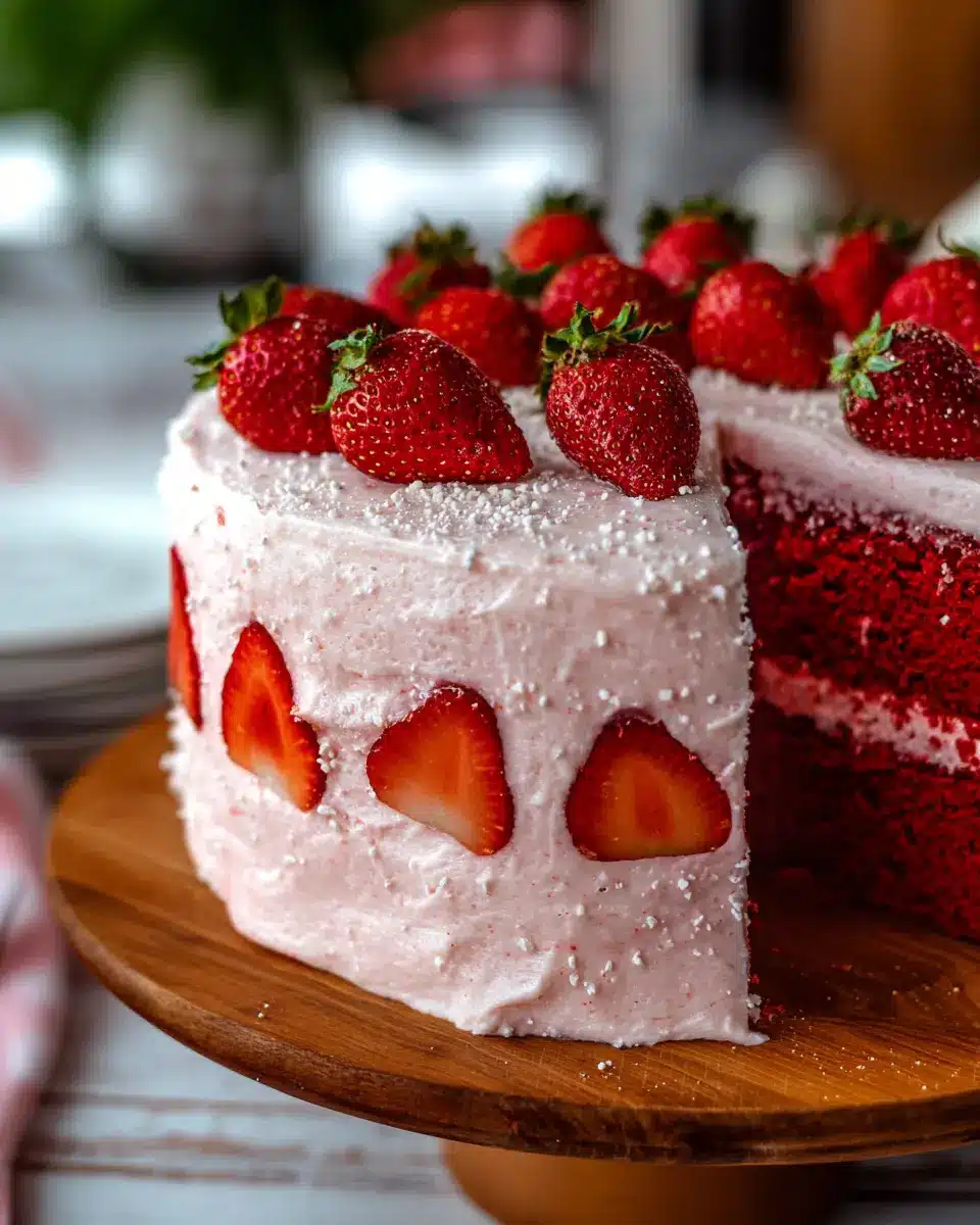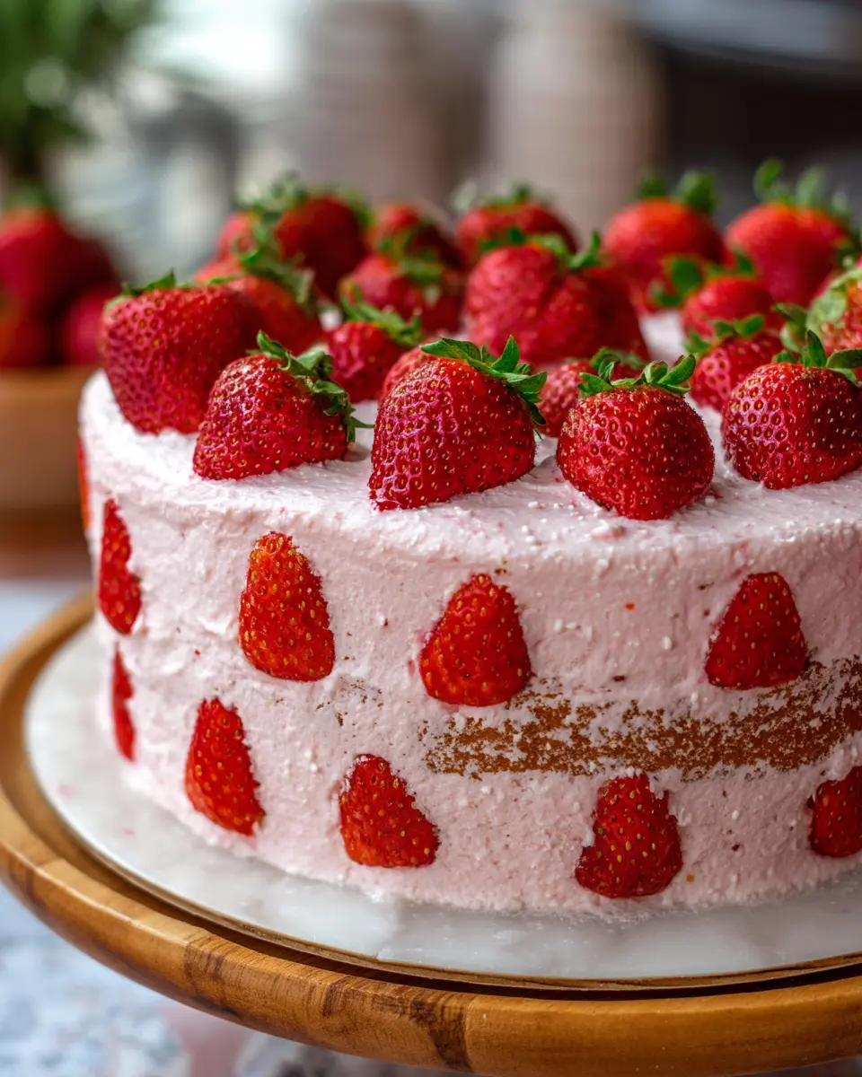 In summary, this delightful strawberry cake is not only a feast for the eyes but also an explosion of flavor. With fresh strawberries woven through each layer and a creamy frosting to top it off, it’s the perfect dessert for any occasion. Enjoy every tasty bite!