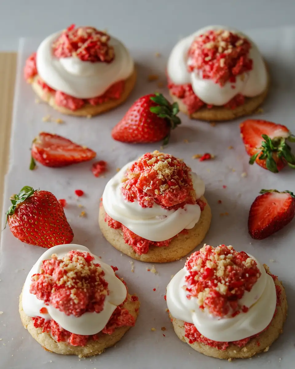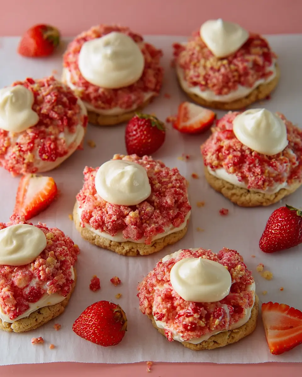 Additionally, these cookies are straightforward to make, requiring just a few common ingredients and minimal effort. Plus, their combination of textures—soft cookie, creamy frosting, and crunchy topping—creates a satisfying dessert experience. For more delightful strawberry recipes, check out AllRecipes or Delish. Now, let’s dive into making these beautiful cookies!