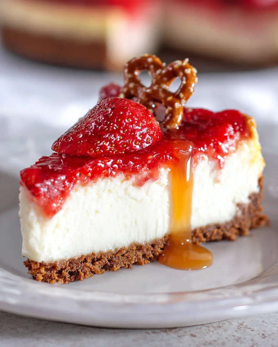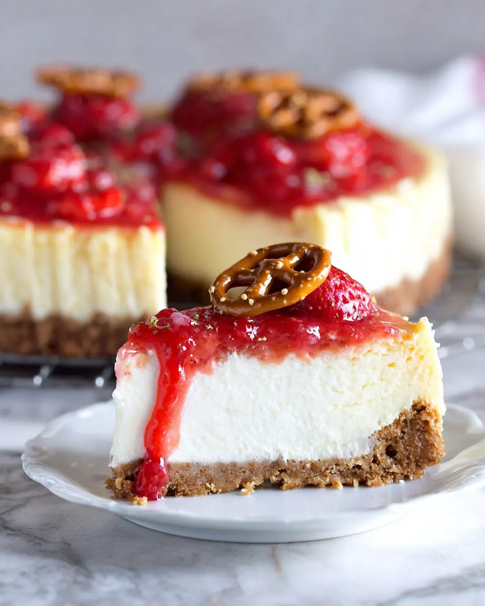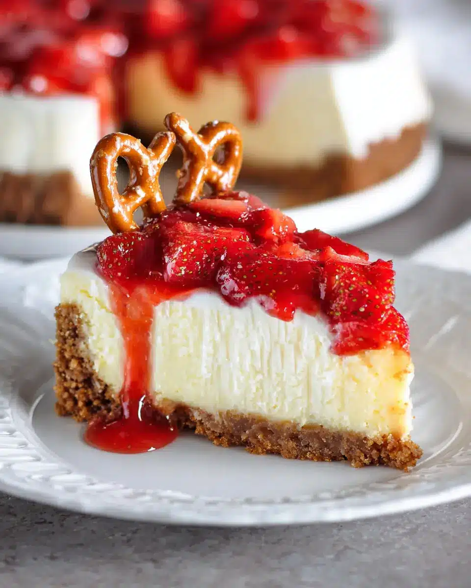 After your cheesecake has chilled, gently remove the sides of the springform pan. Slice the cheesecake into 12 pieces, and serve each slice topped with a generous spoonful of strawberry sauce. For an extra touch, consider garnishing with a dollop of whipped cream and a mini pretzel for decoration. Enjoy your dessert and the compliments that will surely follow!